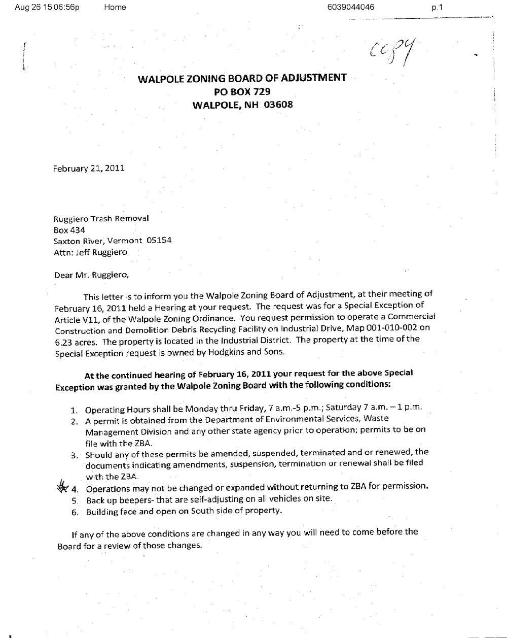 Like me, you may have been wondering just exactly the variance given by the Zoning Board to Ruggerio Trash Removal. Thanks to Sheila Lannon I was given a copy and then France Menk helped me get it to a format that could be inserted here. (The quality of the fax isn’t the best but I hope you can read it.) It remains to be seen what it will mean but at least we know what it said. – Lil