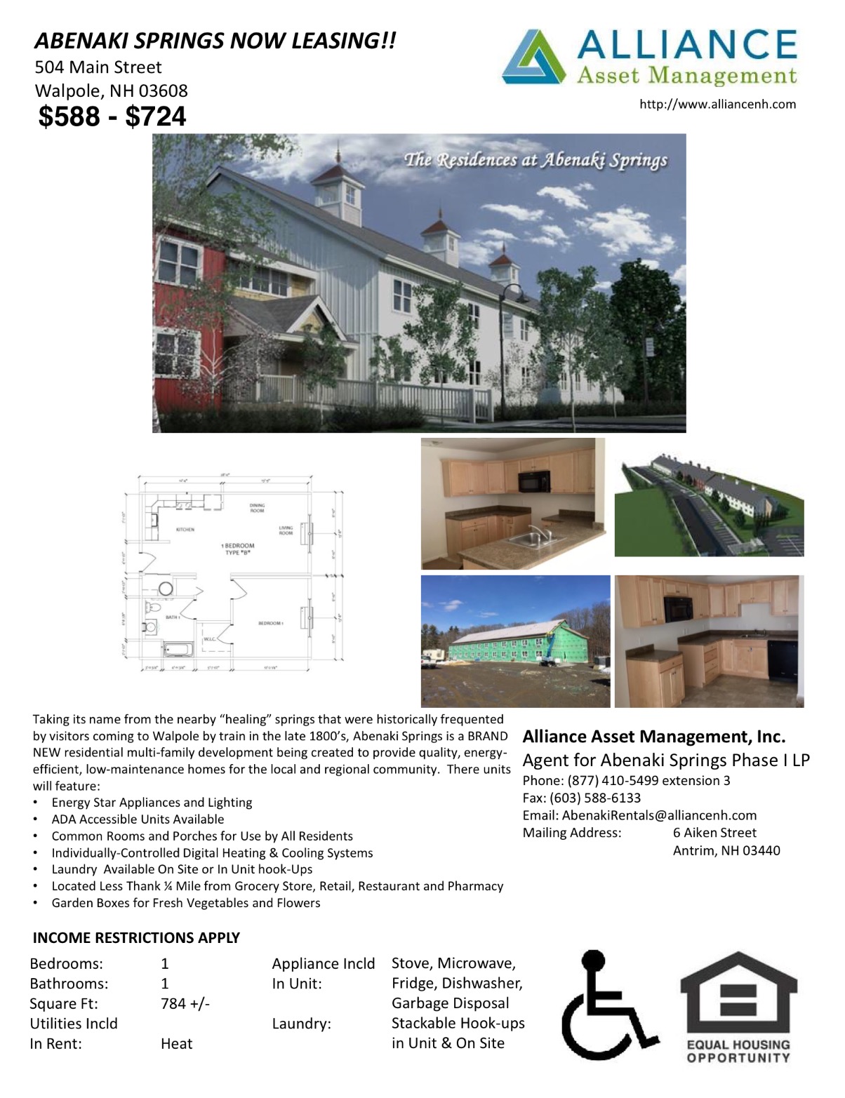 You’re Invited! The Residences at Abenaki Springs will hold its first OPEN HOUSE on Saturday April 16th – 9:30am to 12pm. Please feel free to stop by and view the facility (still under construction), see these apartment homes and have questions answered. The Alliance Asset Management Team will be available to assist with applications, questions and viewings. Hope to see you there!