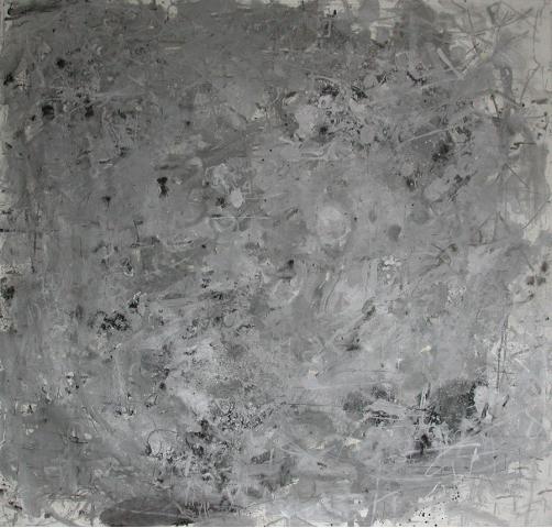 For several years prior, Mulhern’s work had been centered on a strict monochromatic palette of black, white and gray, often incorporating aluminum paint. He found a tremendous range in this stark spectrum, often referencing them as “color paintings” in spite of their lack of color. Highly influenced by the New York Abstract Expressionist movement in the 1960’s, Mulhern’s surfaces were heavily marked by pooling paint, drips and curves, paintings of tremendous vibrancy and depth and nuance. In the years immediately following September 11, Mulhern decamped to a temporary studio in Long Island City, where he began experimenting with paints from his Cedar Street studio – paints mixed and infused with the ash from the lost Trade Towers. In his words, the paintings became more “severe”, and Reeves agrees: “They have a power and force that distinguish them from prior works. Many have a roiling dynamism that one cannot help but equate with the events of that day”.