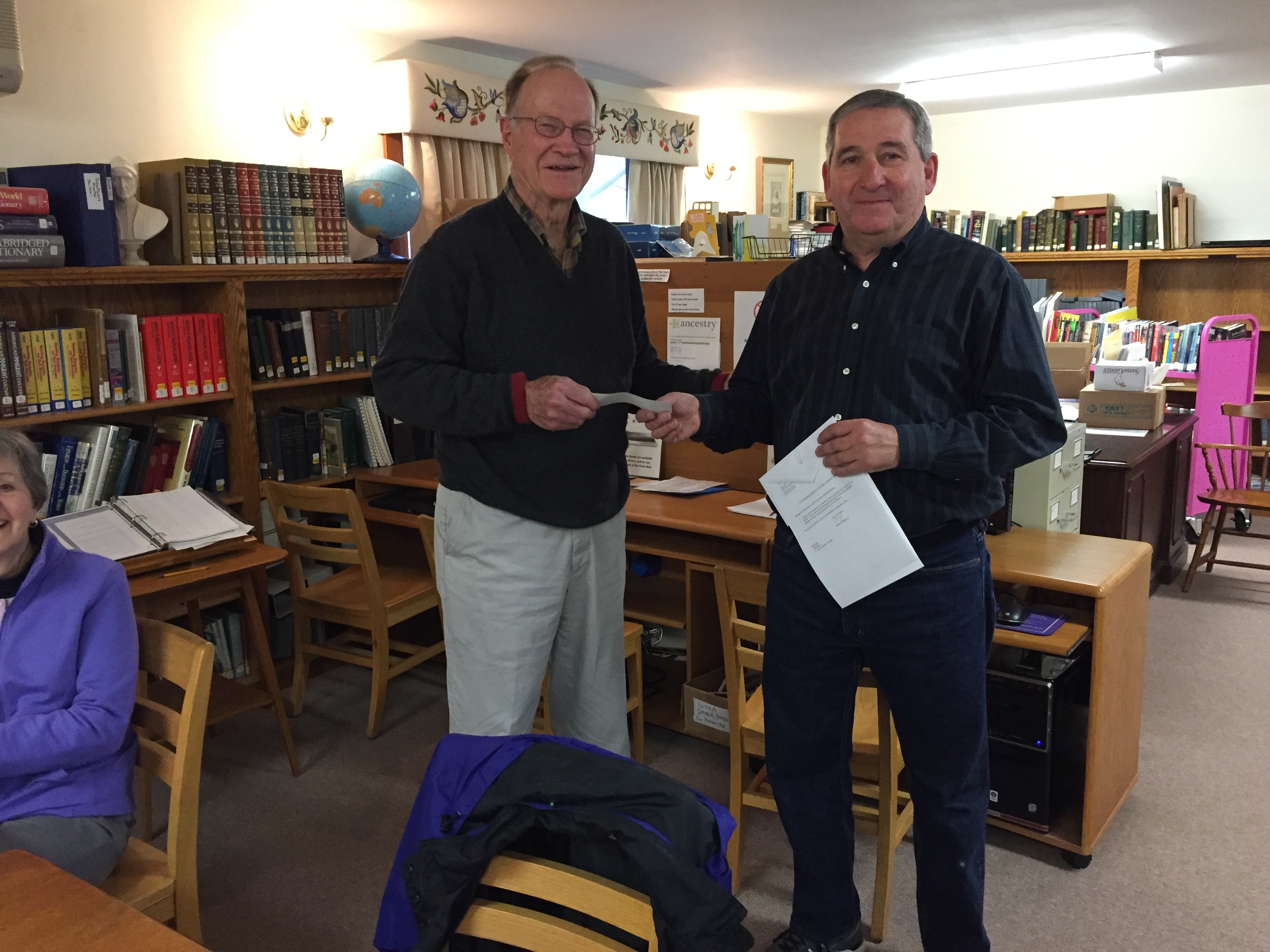 This photo captures the presentation by Frank Tarantino (on the right) to Fred Ernst, Chairman of the Library Trustees.