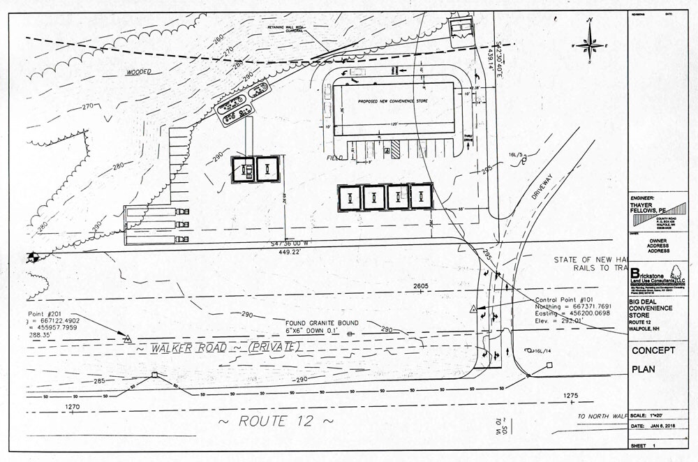 Below is Concept Plan for the proposed gas station/convenience store on 1.5 acres of land at the intersection of South Street and Route 12. Per D&C Transportation’s application for an exception to the Zoning Ordnance to build here, “an appropriate site for this type of use requires a minimum of two to three acres of vacant developable land…” The proposal includes space for three semi-trucks (which usually idle while parked), 18 parking spaces, and 10 spaces for fuel filling.