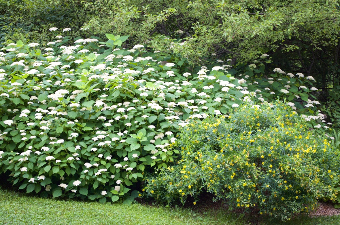 Two of our best summer shrubs for pollinators at Distant Hill – Smooth Hydrangea (Hydrangea arborescence) and Kalm’s St. John’s wort (Hypericum kalmianum).