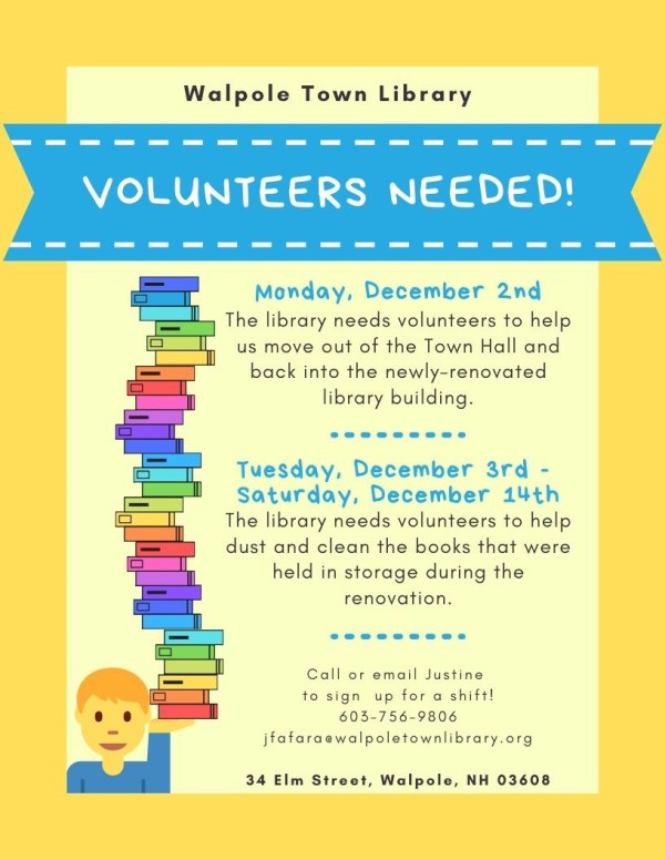 Moving day is Monday December 2nd and we’re looking for people to help move boxes and furniture from Town Hall back to the Library. If you have a truck, you get bonus points! We’re asking all volunteers to be at Town Hall at 9am. Please stop by the library and sign up so we know how many helping hands to expect.