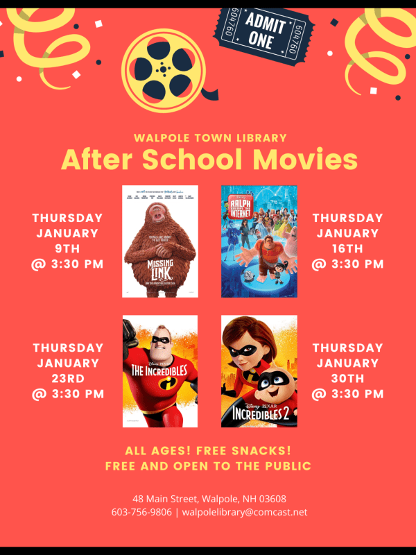 Join us at the library on Thursday afternoons for a family friendly movie and snacks! Everyone is welcome; these events are free and open to the public.