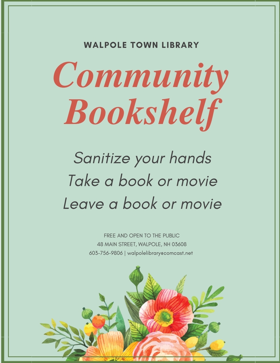 The library may be closed until May 4 but you can still get a book. The Community Bookshelf will be right outside the library door. Sanitize your hands then take a book or movie and leave a book or movie. We’re all in this together!