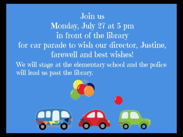 Wow! Wish we could participate. Justine has been a real gift to Walpole and has really enhanced the entire library experience even through COVID 19. It has been so much fun hearing all of the offerings of the library, of the new building addition and configuration of the library making it more user friendly. Thank you Justine! Best wishes on your new endeavor, Sue & Chuck Bingaman