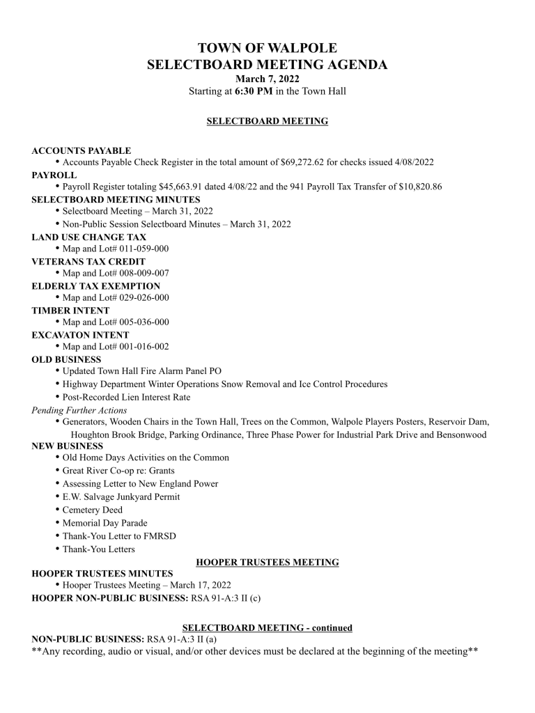 Selectboard Meeting Agenda – 4/7/22
