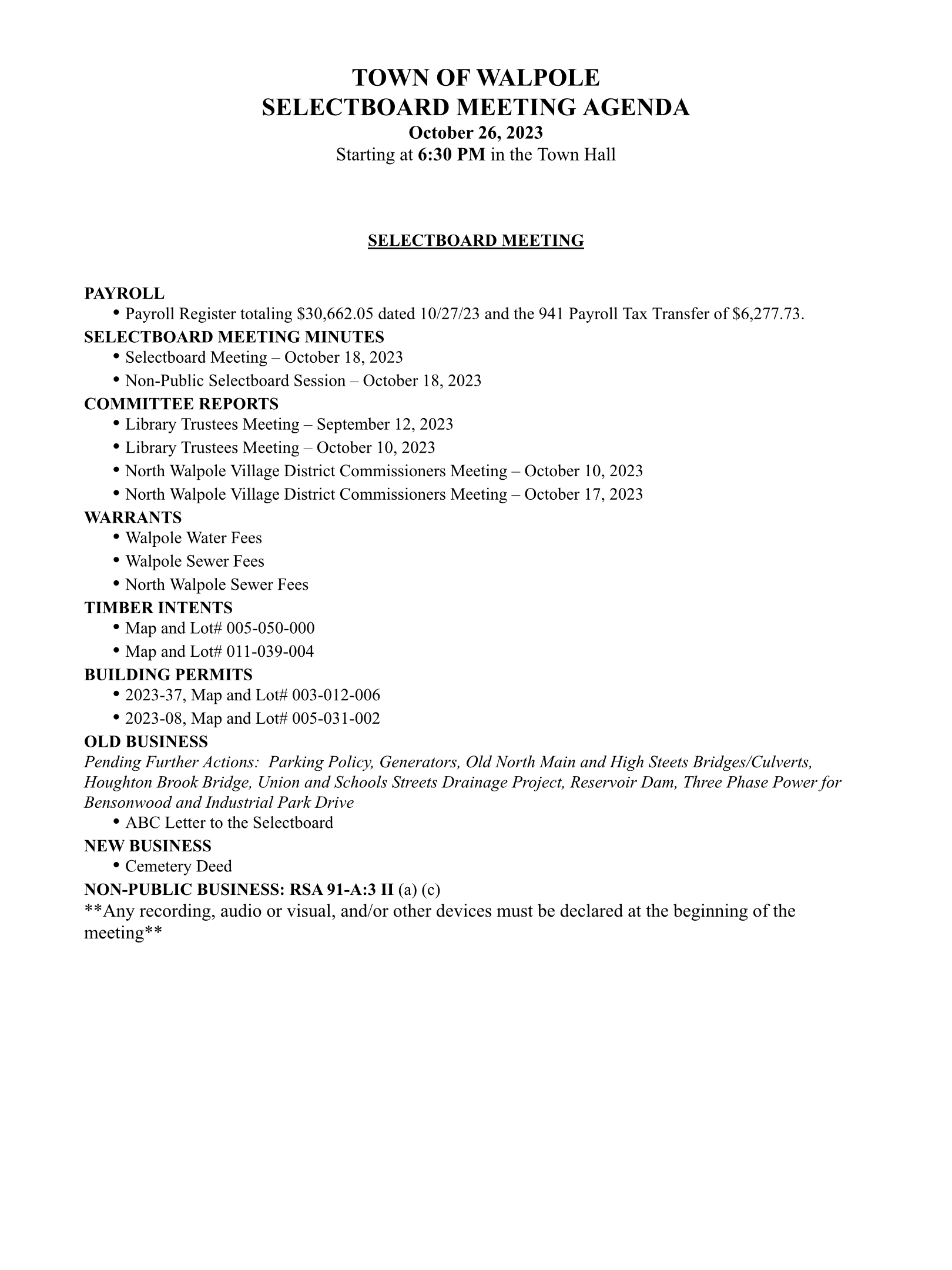 Selectboard Meeting Agenda – 10/26/23
