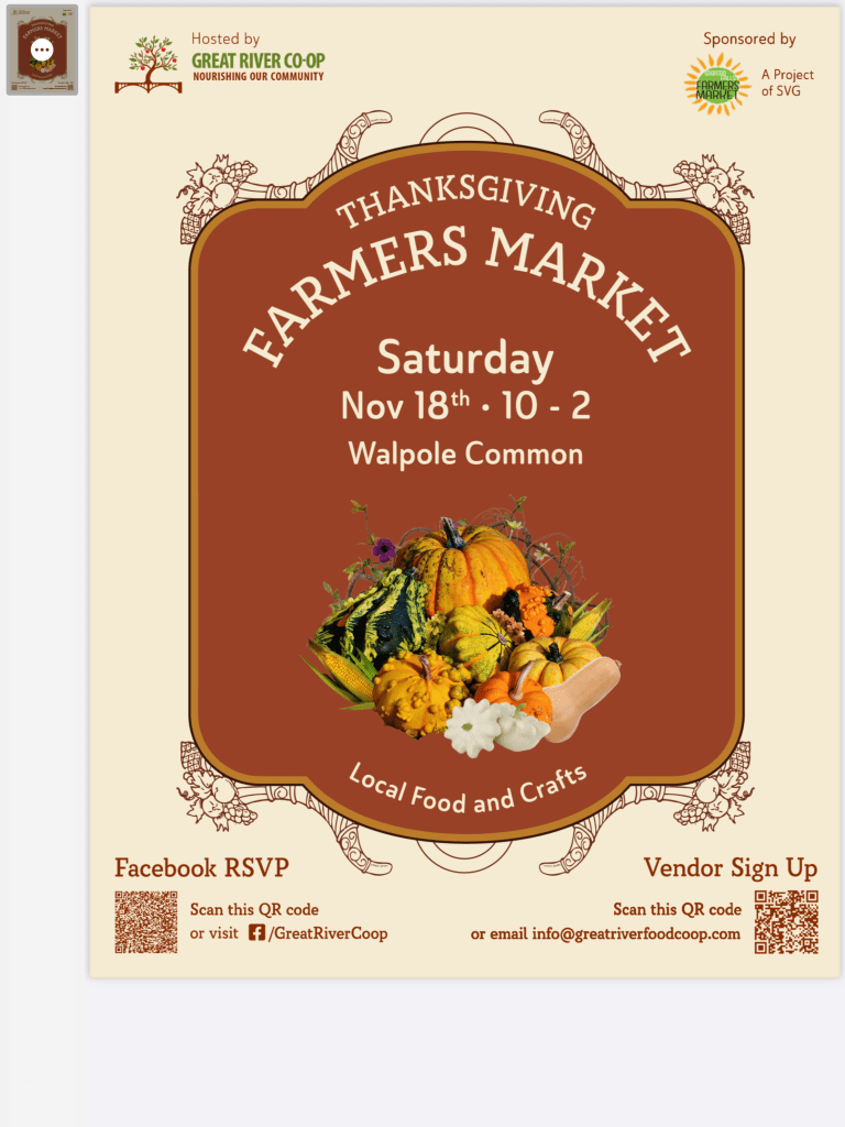 The Thanksgiving Farmers Market is hosted by the Great River Co-op and sponsored by the Greater Falls Farmers Market.
