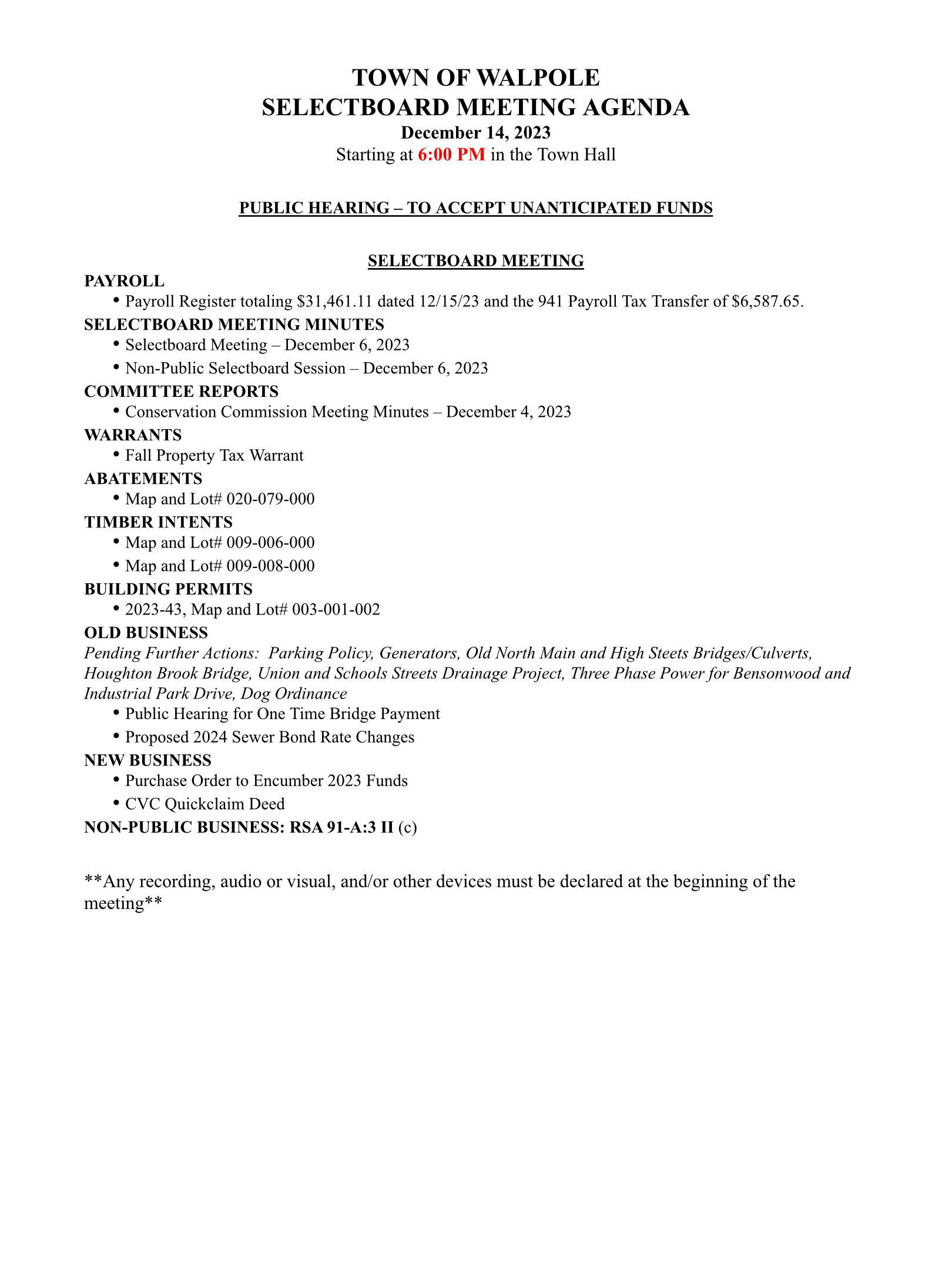 Selectboard Meeting Agenda – 12/14/23