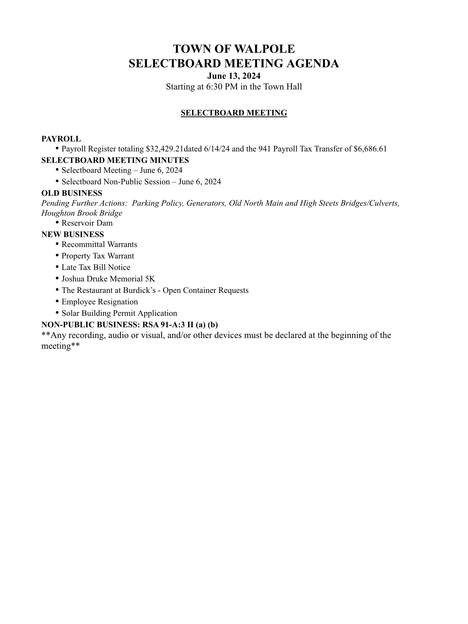 Selectboard Meeting Agenda – 6/13/24