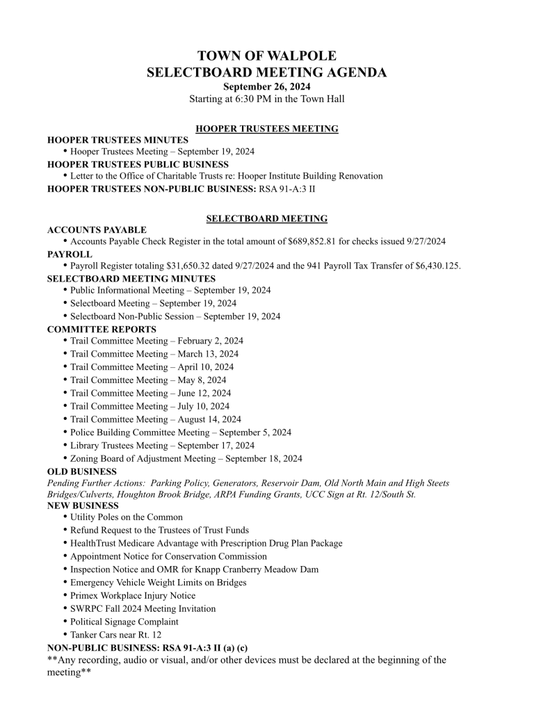 Selectboard Meeting Agenda – 9/26/24