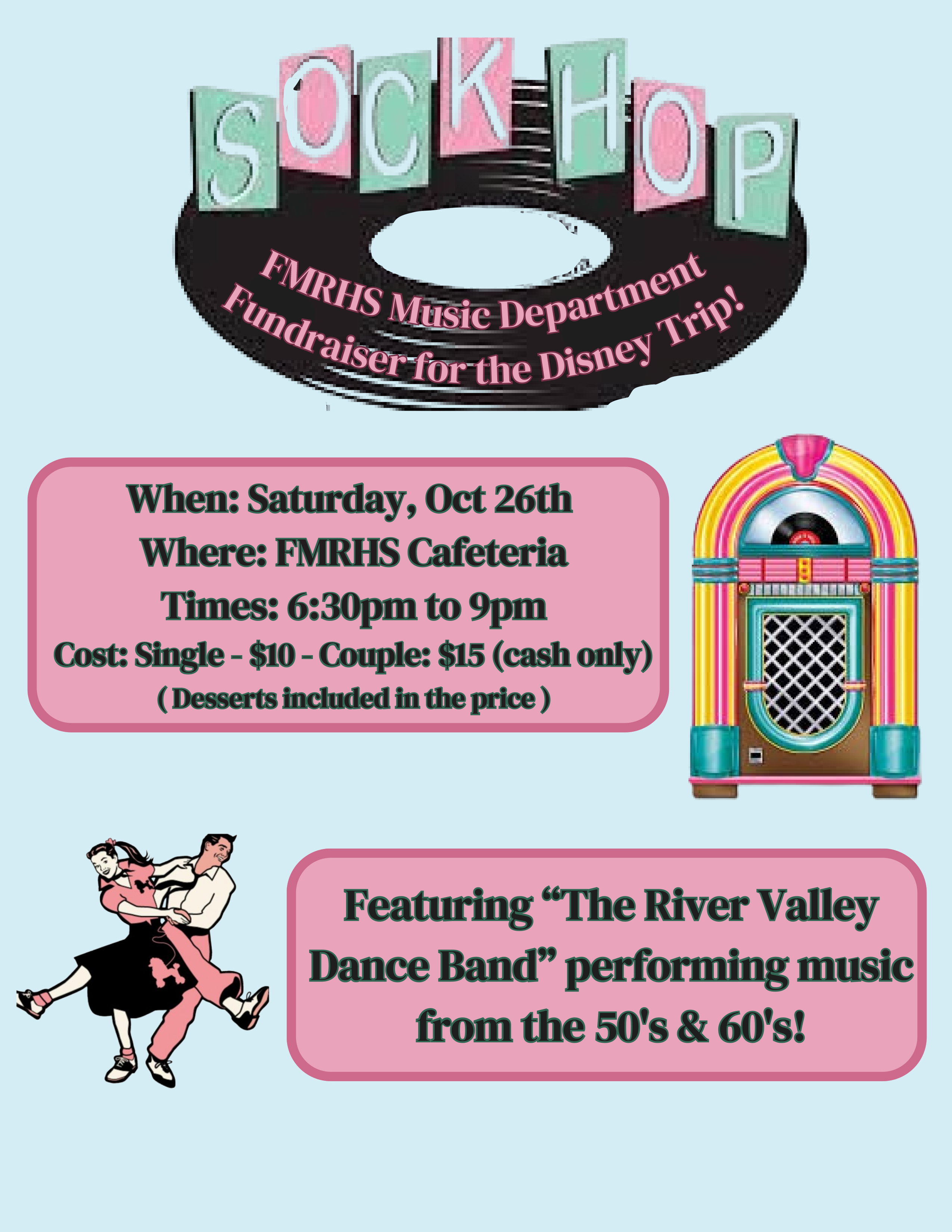The Fall Mountain Regional High School Band Department is holding a Sock Hop Fundraiser on Saturday, October 26, 2024 – 100% of the proceeds will help send FMRHS music students to Disney World this spring where they will attend Disney Imagination Campus Soundtrack Sessions and work with professional Disney musicians. They will get to record their own demo tracks and learn about the process of making soundtracks for movies!