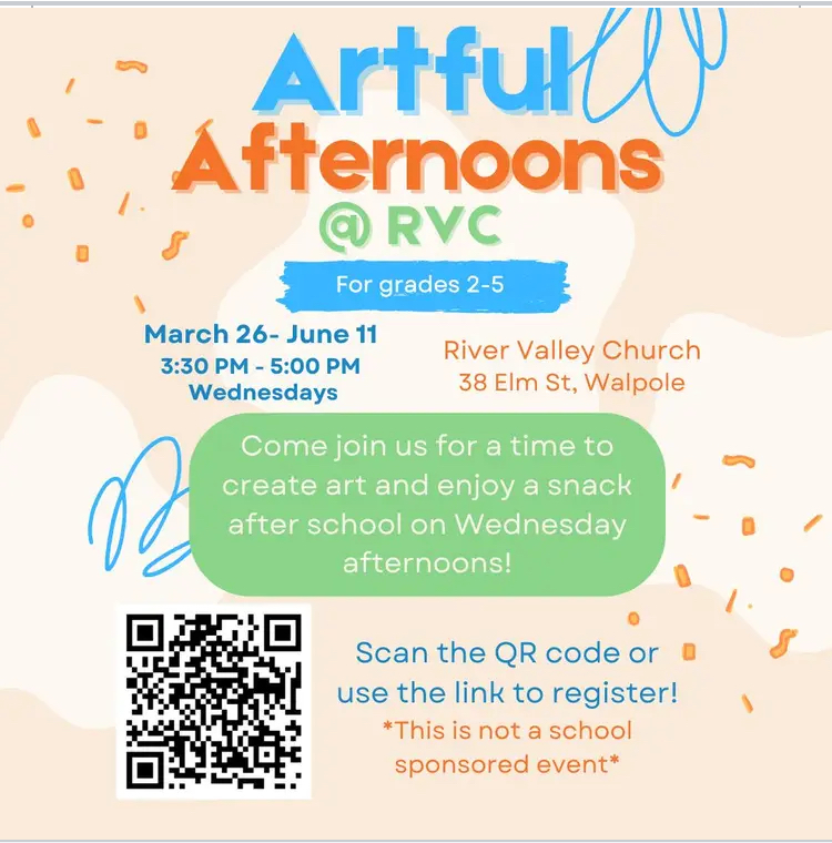 Beginning Wednesday March 26th, River Valley Church is excited to welcome 2nd – 5th grade students to join us in creating art and sharing a snack after school. This program is free, but does require registration. Weekly attendance is not required to participate – join us when you can! The program will run through June 11th. Students at the Walpole School can take Bus 2 to be dropped off at the church. Students must be picked up by a parent or legal guardian by 5 pm. This program is being led by Emily Heddon and Beth Vickers.