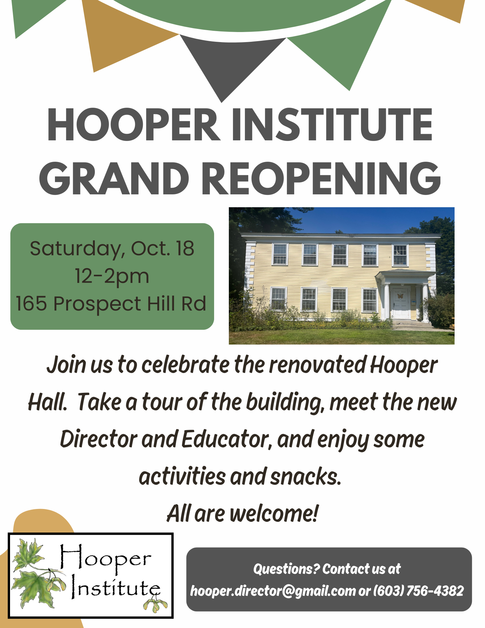 Hooper Institute Grand Reopening. Saturday, October 18, 2025 from 12:00 - 2:00 pm. 165 Prospect Hill Road. Join us to celebrate the renoated Hooper Hall. Take a tour of the building, meet the new Director and Educator, and enjoy some activities and snacks. All are welcome! Questions? Contact us at hooper.director@gmail.com or 603-756-4382.