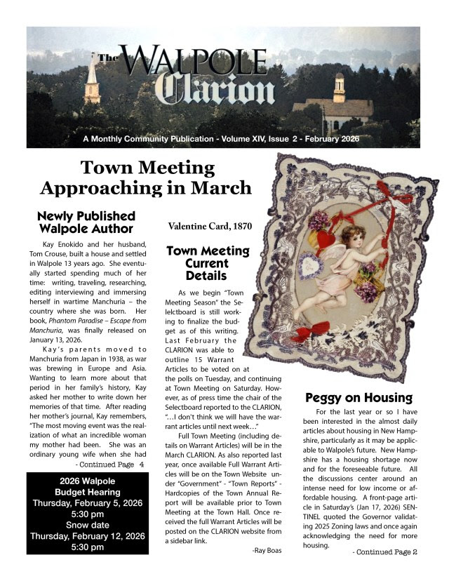 And will be at the post offices late morning January 29th for mailing to all postal addresses in Walpole, North Walpole, and Drewsville — 1924 addresses. I am pleased with the wide range of articles on activities, information, and fun reading on these twenty pages, and I hope you enjoy this issue as well.