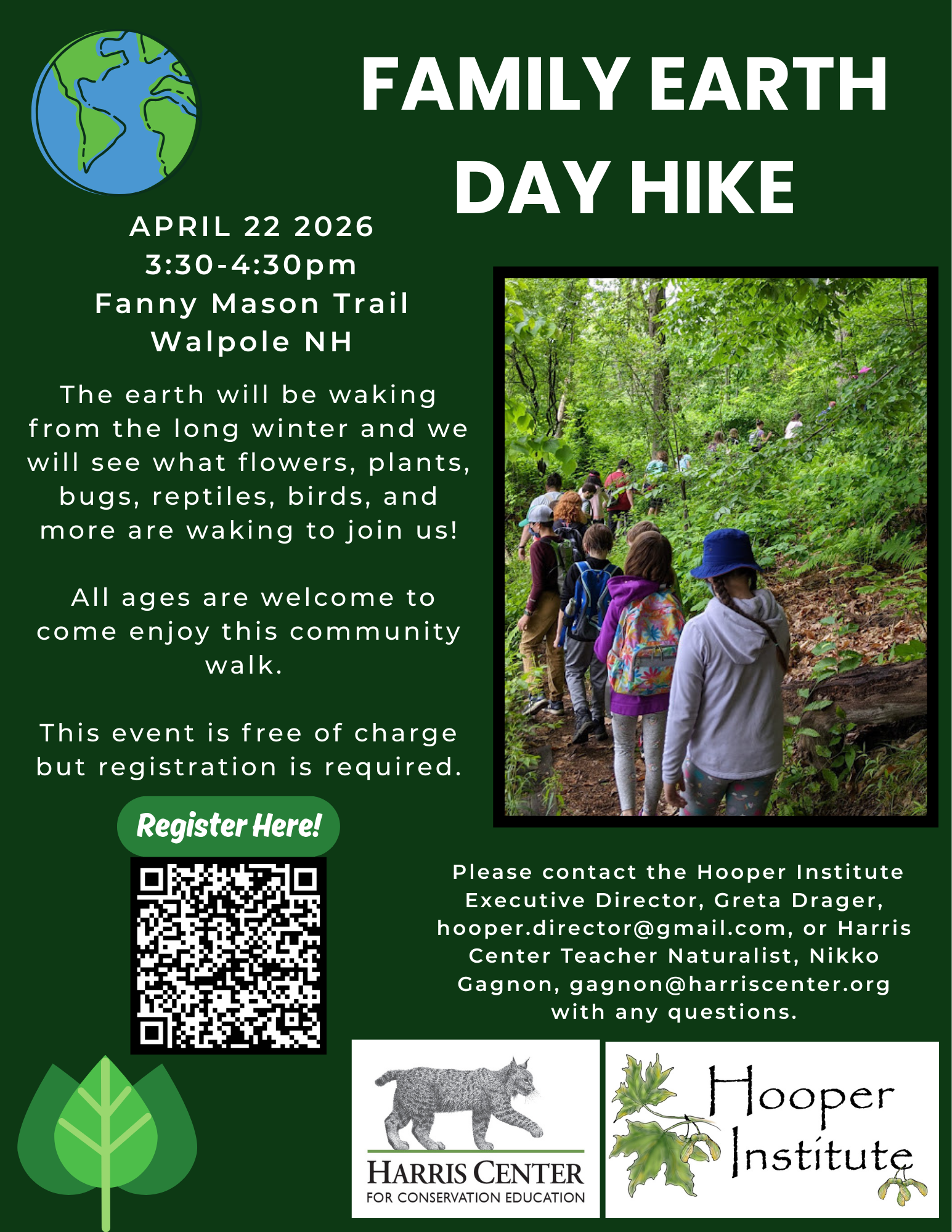 Join Hooper Institute and Harris Center Staff for a fun and informative Earth Day Hike on the Fanny Mason Trail in Walpole! The Earth will be waking from the long winter and we will see what flowers, plants, bugs, reptiles, birds, and more are waking to join us! All ages are welcome to come enjoy this community walk.