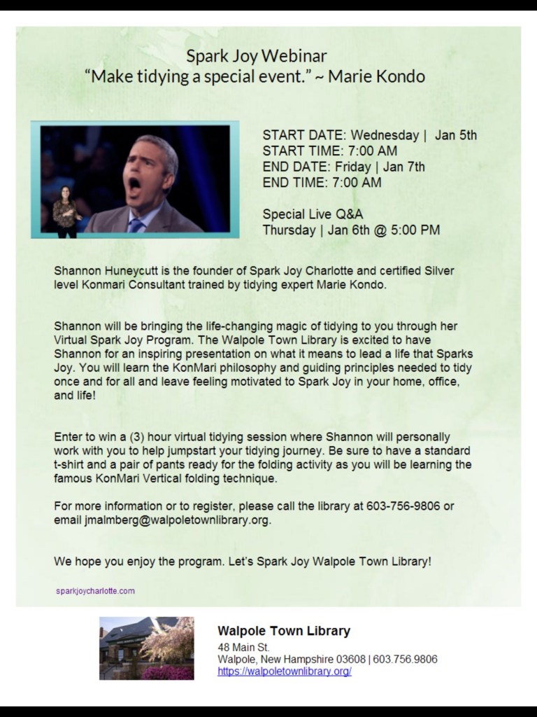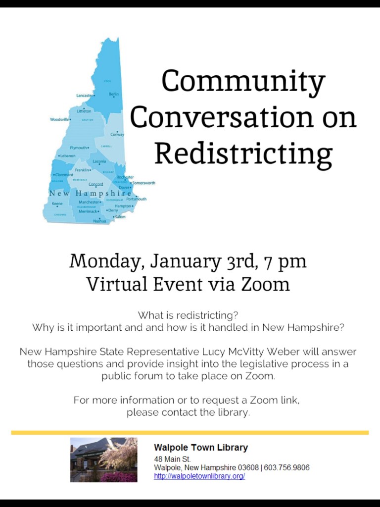 Vilas Bridge: Ms. Mayberry advised that Mr. Mark Houghton will talk with Mr. Jeff McClure about ideas regarding the Vilas Bridge. Mrs. Pschirrer has been following these emails. It is a positive step for moving forward. She thanked Ms. Mayberry for referring them. Ms. Mayberry is hoping opportunities will open up for the North Walpole Village water as well. They would like a water source back-up well. Mr. Dalessio mentioned Mr. Mark Houghton is exploring many sources of funding for Walpole projects.