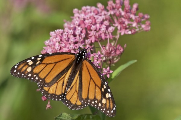 A male monarch, identified by the two black dots on its inner wings, feeding on a Swamp Milkweed flower.