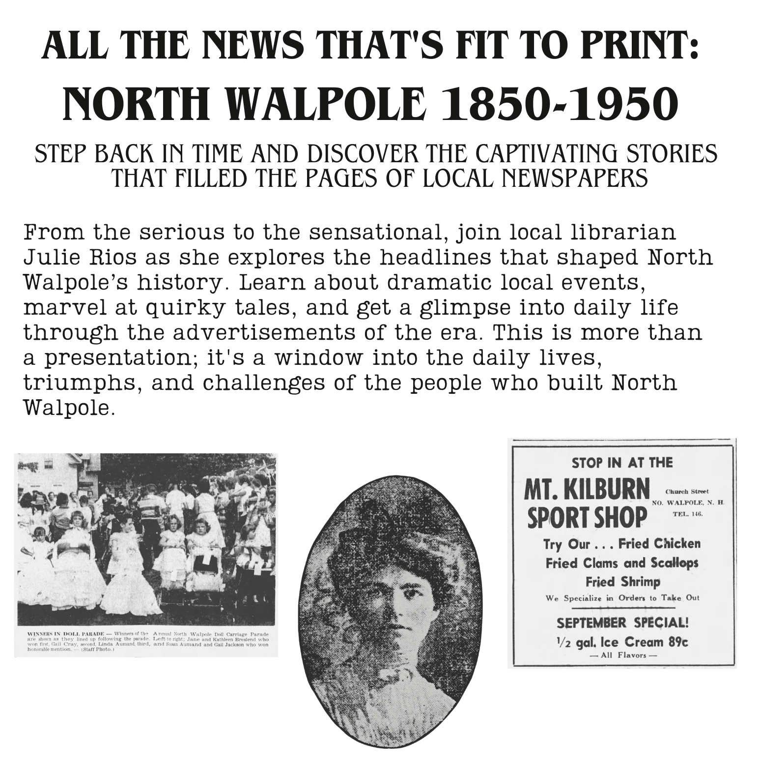 On October 4 at 12:30 pm, Julie Rios, back by popular demand, is going to present “All the News That’s Fit to Print: North Walpole 1850-1950” with some great clips and pictures!