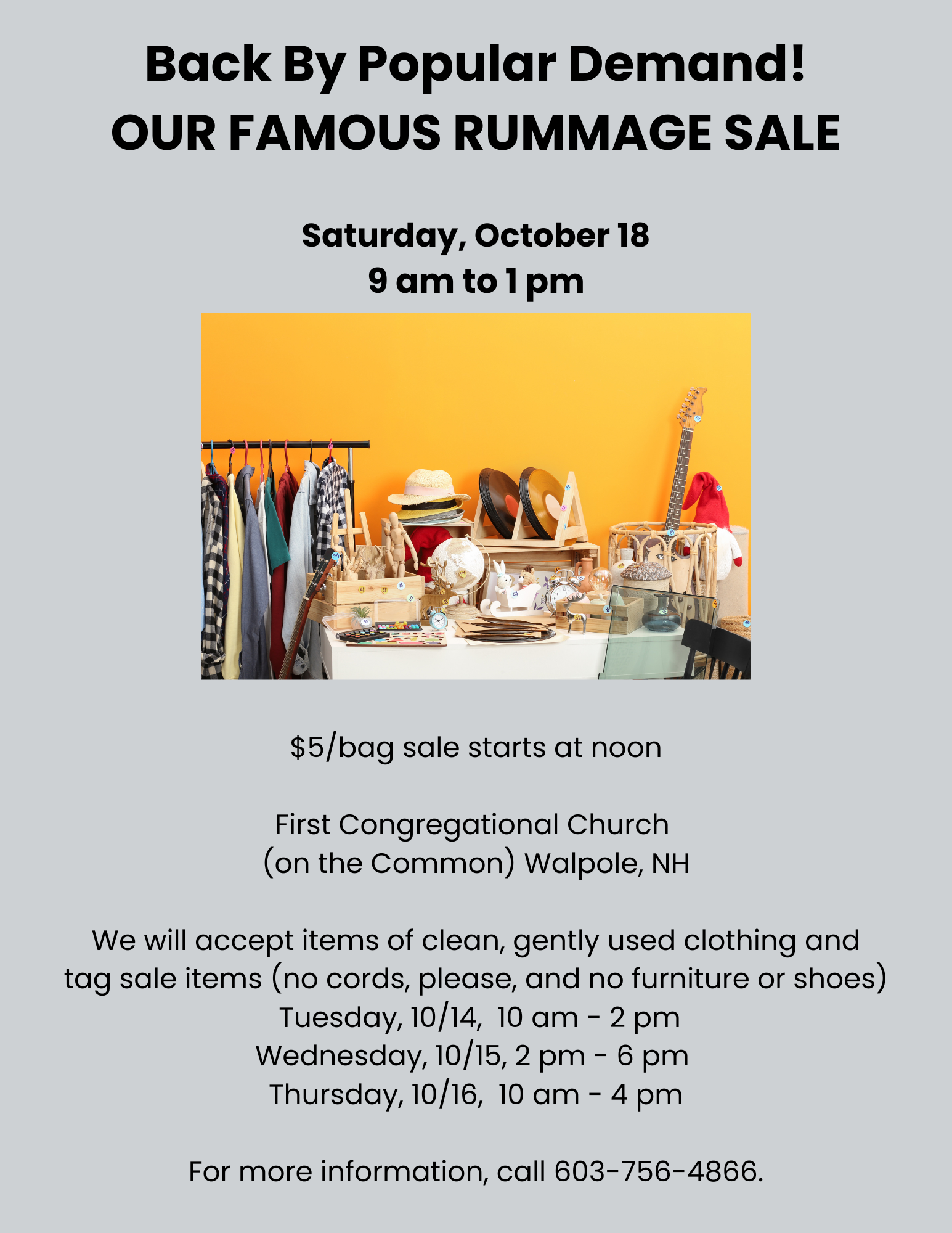 The Walpole Unitarian Church will hold its annual Harvest Food Sale outside the Post Office on October 11th, 2025, from 9 – 11:15. Come and get some of our delicious homemade items – both sweet and savory. As usual, we’ll have things you can take home for lunch or supper, or put in your freezer for later. There will also be goodies that you can take on the road if you’re traveling. We look forward to seeing you at our table. Come early for the best choices!