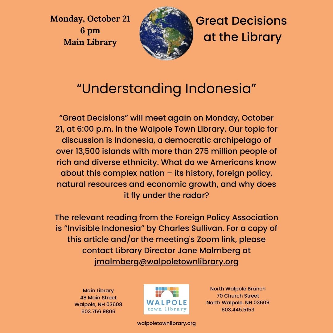 We will meet in the Walpole Town Library on Monday, November 10, at 6:00 pm. The relevant reading from the Foreign Policy Association is “AI and American National Security,” by Julie George. A copy of this article can be emailed to you upon request sent to Library Director Jane Malmberg: jmalmberg@walpoletownlibrary.org If you are joining via Zoom, please request the Zoom link from Jane Malmberg prior to the meeting and join at 6:30 pm, after the “Master Class” video.