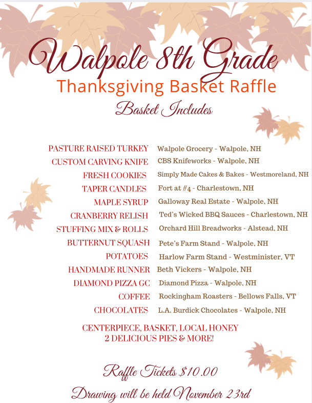 We are thrilled to share that the Thanksgiving Basket Raffle to benefit the Walpole Elementary School 8th Grade was very successful! We met our fundraising goal which will cover the costs of their graduation ceremony & celebration and an end of year class trip (TBD)! The Walpole community is so generous and we have many people to thank. Many local businesses donated items to our basket, and the community as a whole, generously purchased raffle tickets. We thank everyone for your support to make this fundraiser so successful. The winner of the basket was drawn at the Farmers Market with the prize going to Terri Patch!